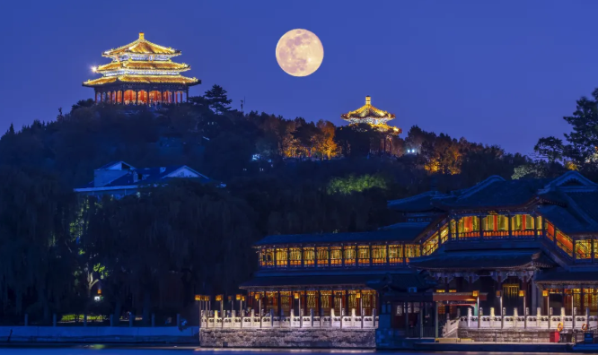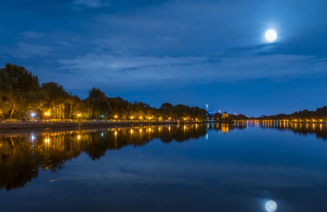 北海公园位于北京市西城区文津街1号,除了皇家园林的古韵之外,公园的夜景也很绝美。当北海公园褪去了白天的喧闹,灯光隐隐,柳叶轻垂,湖水平静,夜色显得安详静谧。